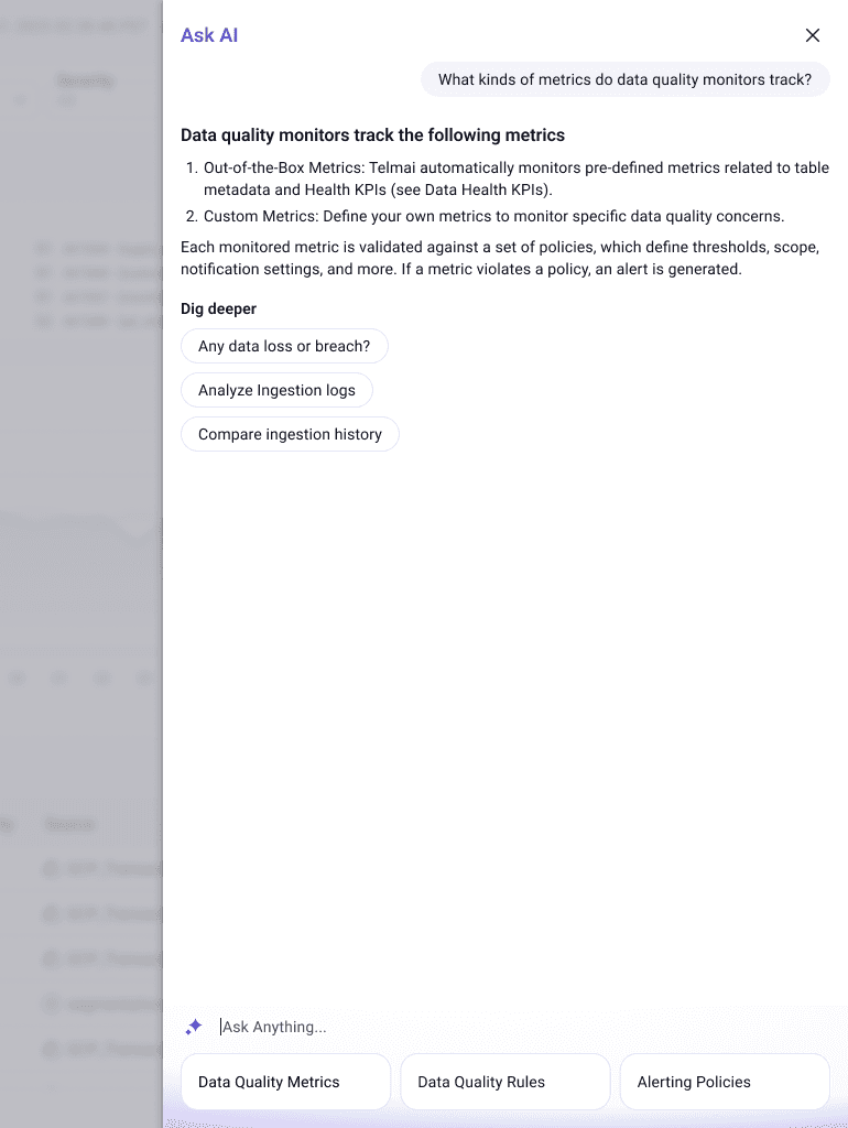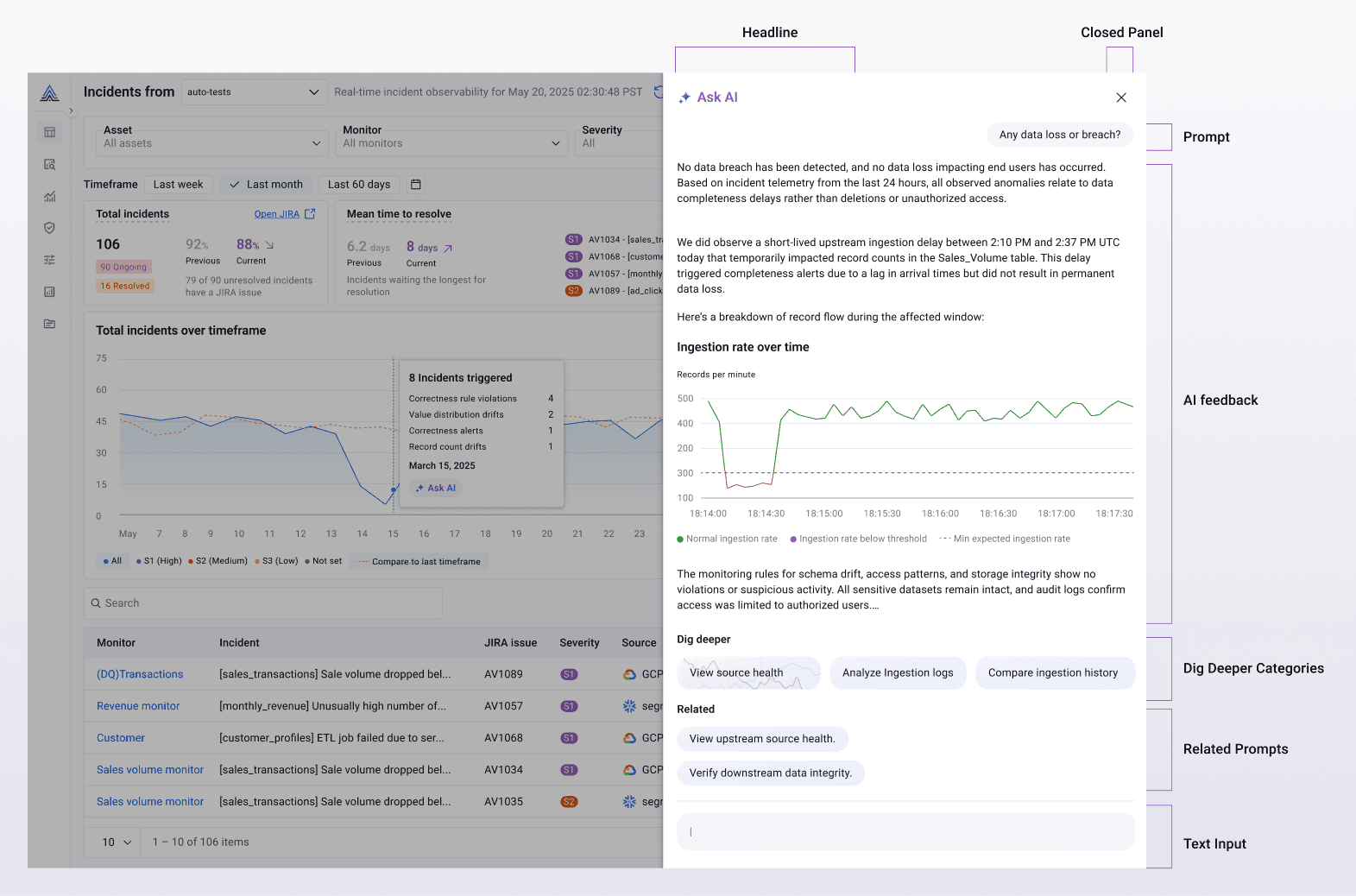 As part of building a consistent and scalable AI experience, we developed a set of reusable AI components that could easily integrate into Actian’s existing design system. The goal was to create flexible modules that could adapt to different use cases across the Observability Platform and serve as a foundation for future AI features.