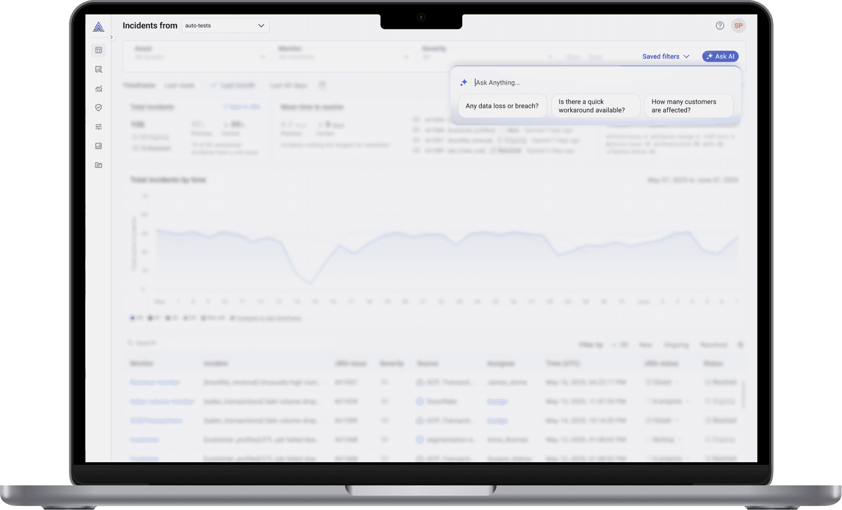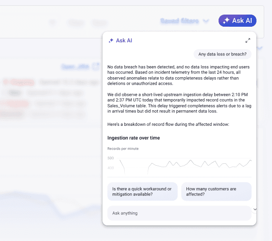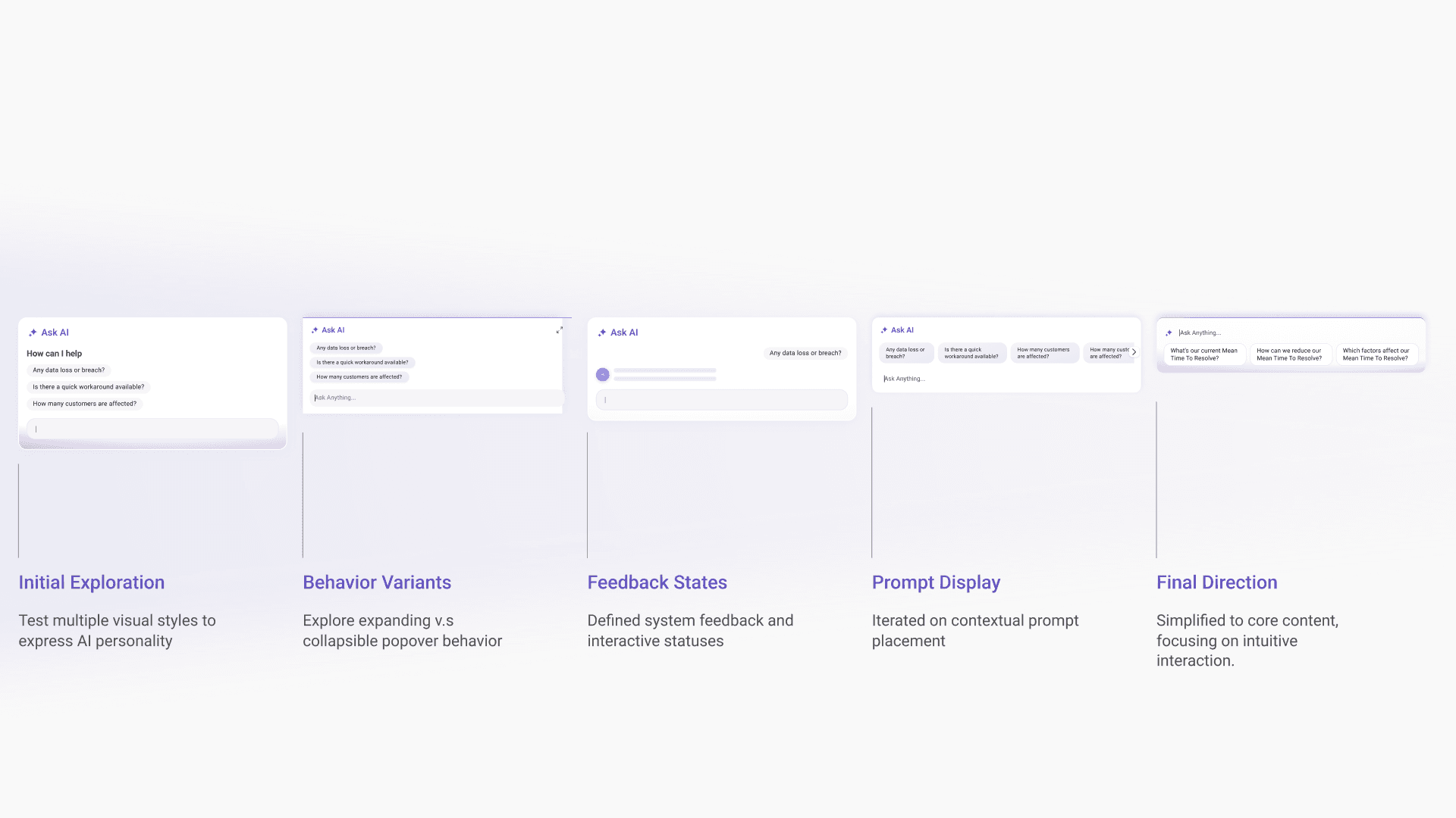 When I joined the project, the platform had no cohesive AI experience. Early concepts focused on a single “Ask AI” popover floating near the search bar—useful in theory, but isolated in practice. It didn’t scale across logs, incidents, or charts, and it pulled users away from their natural workflow.
