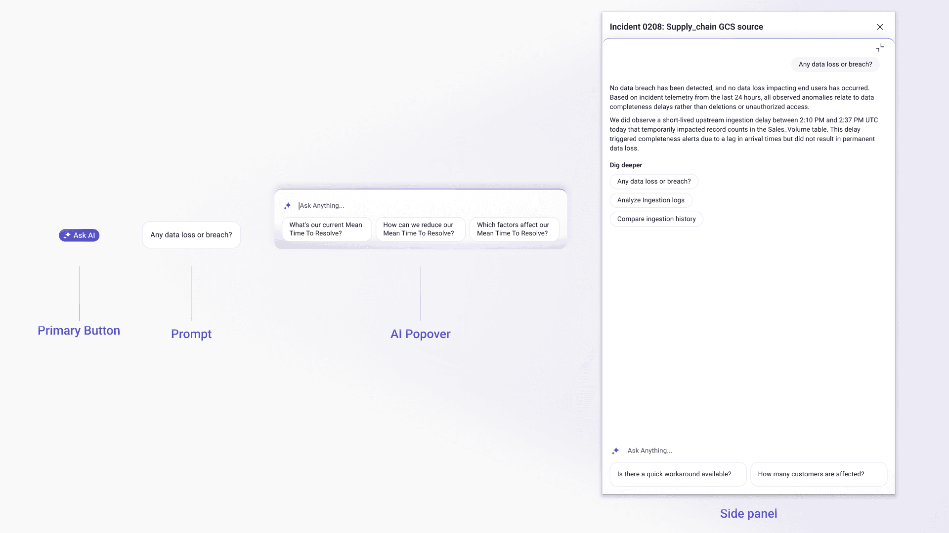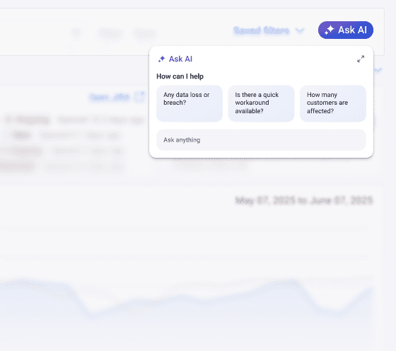 Each prompt is generated based on the user’s current context — whether viewing a chart, exploring an incident, or selecting a data field. Instead of forcing users to start from scratch, the system suggests relevant follow-up questions or actions tied to what they are already looking at. This approach helps users stay in flow and reduces effort, making AI feel like a natural extension of the workflow.