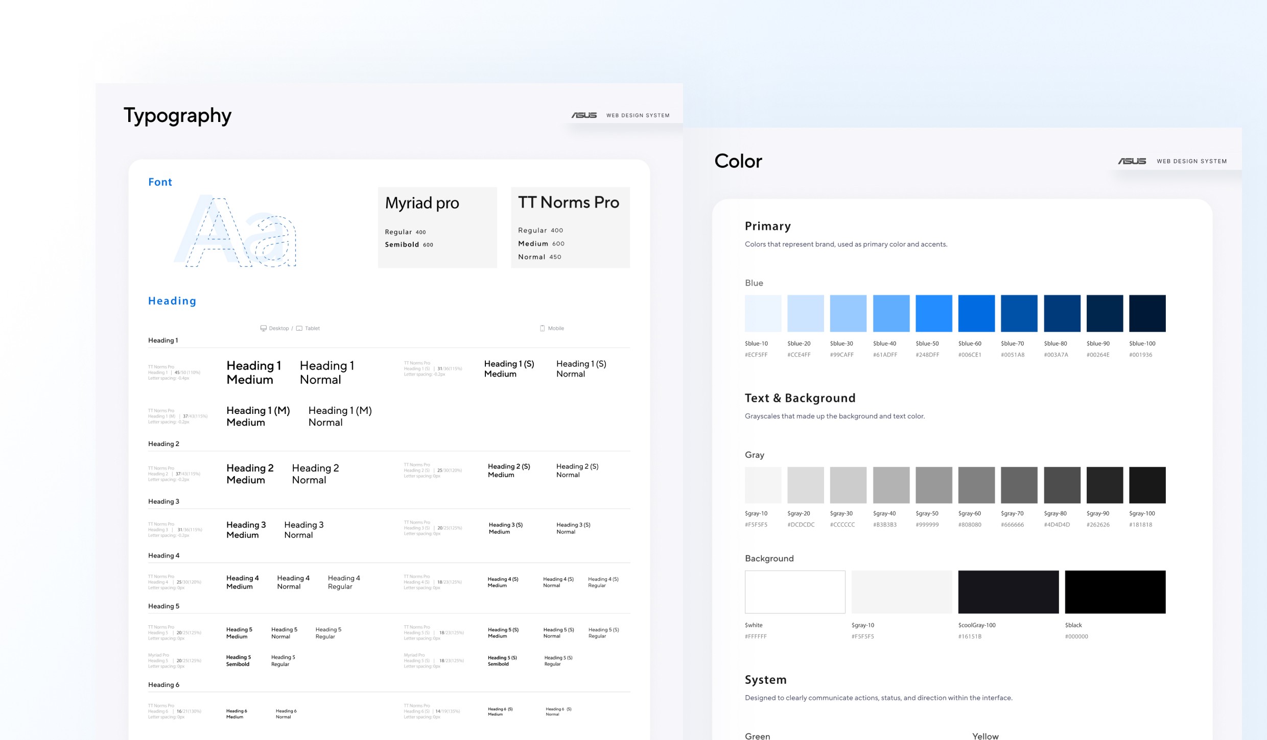 ASUS’s primary blue functioned as both a brand identifier and the most frequently used UI color. Without clear rules, it was applied inconsistently across components, modes, and backgrounds, often leading to contrast and hierarchy issues. To address this, we defined a structured blue color scale, mapped each shade to specific use cases, and validated all color pairings against WCAG standards. This allowed the primary color to remain brand-forward while behaving predictably and accessibly across the system.