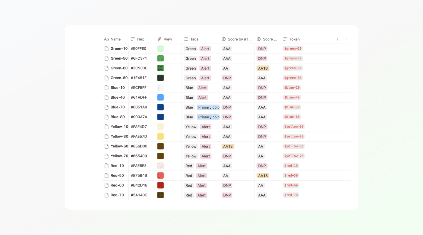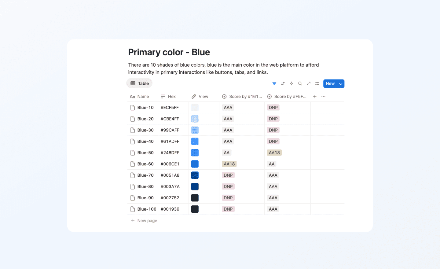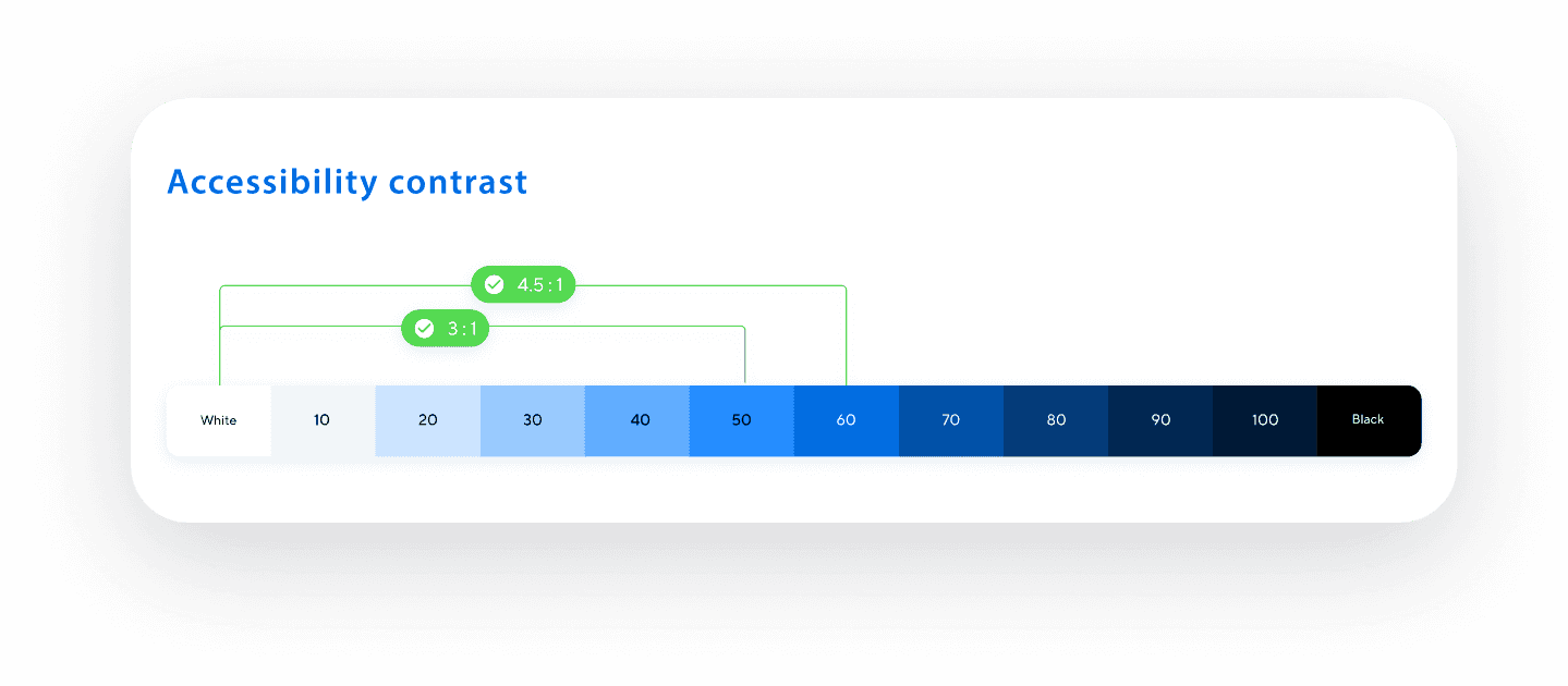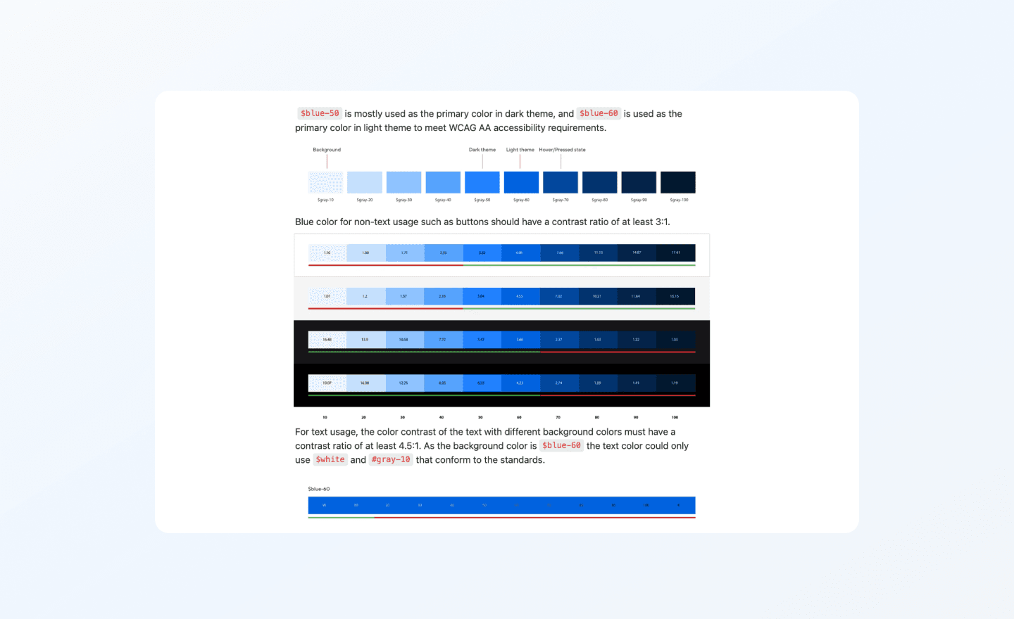 We defined a 10-shade blue color scale and mapped each shade to specific use cases, validating all text and component pairings against WCAG 2.1 AA contrast requirements.