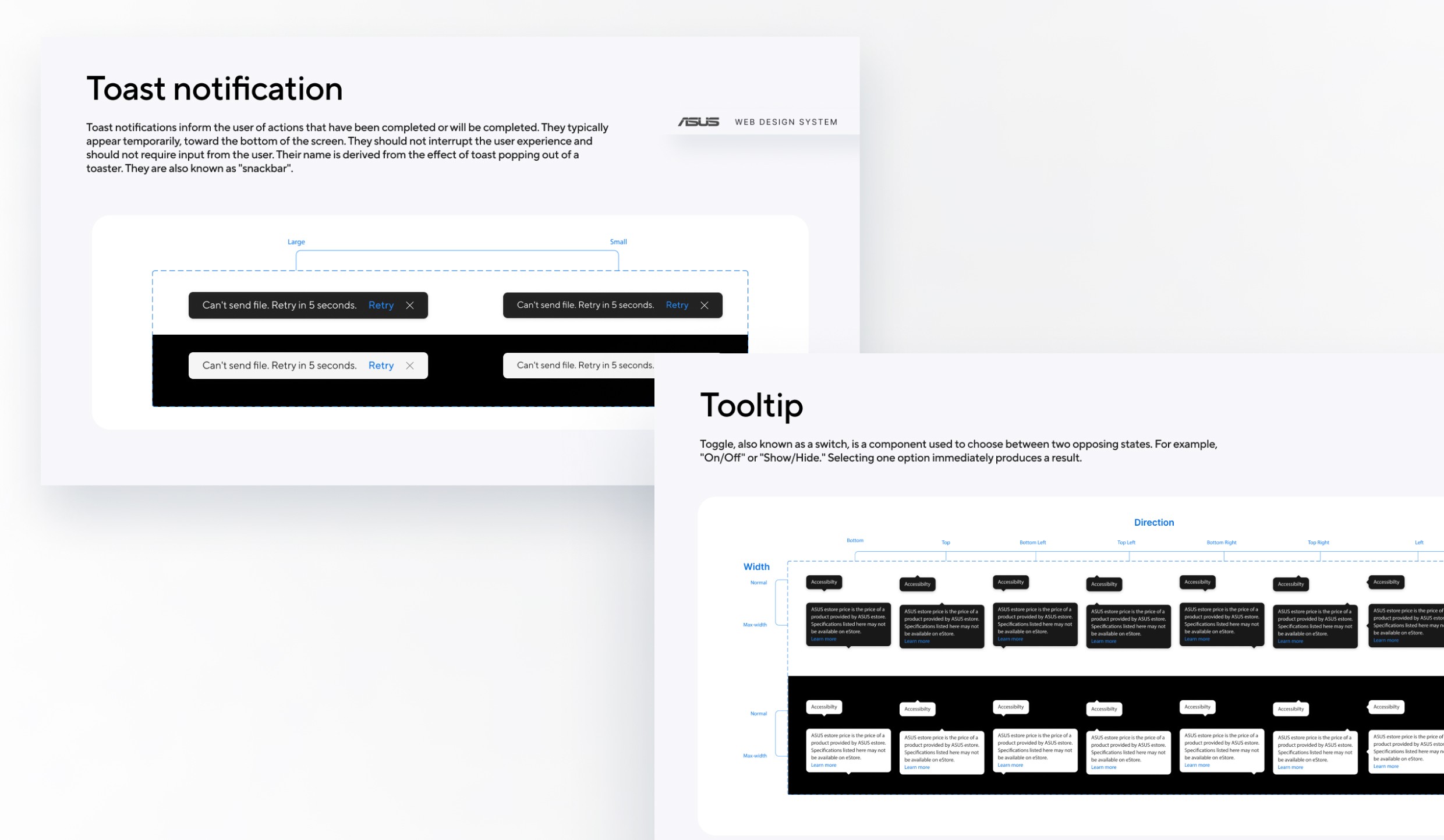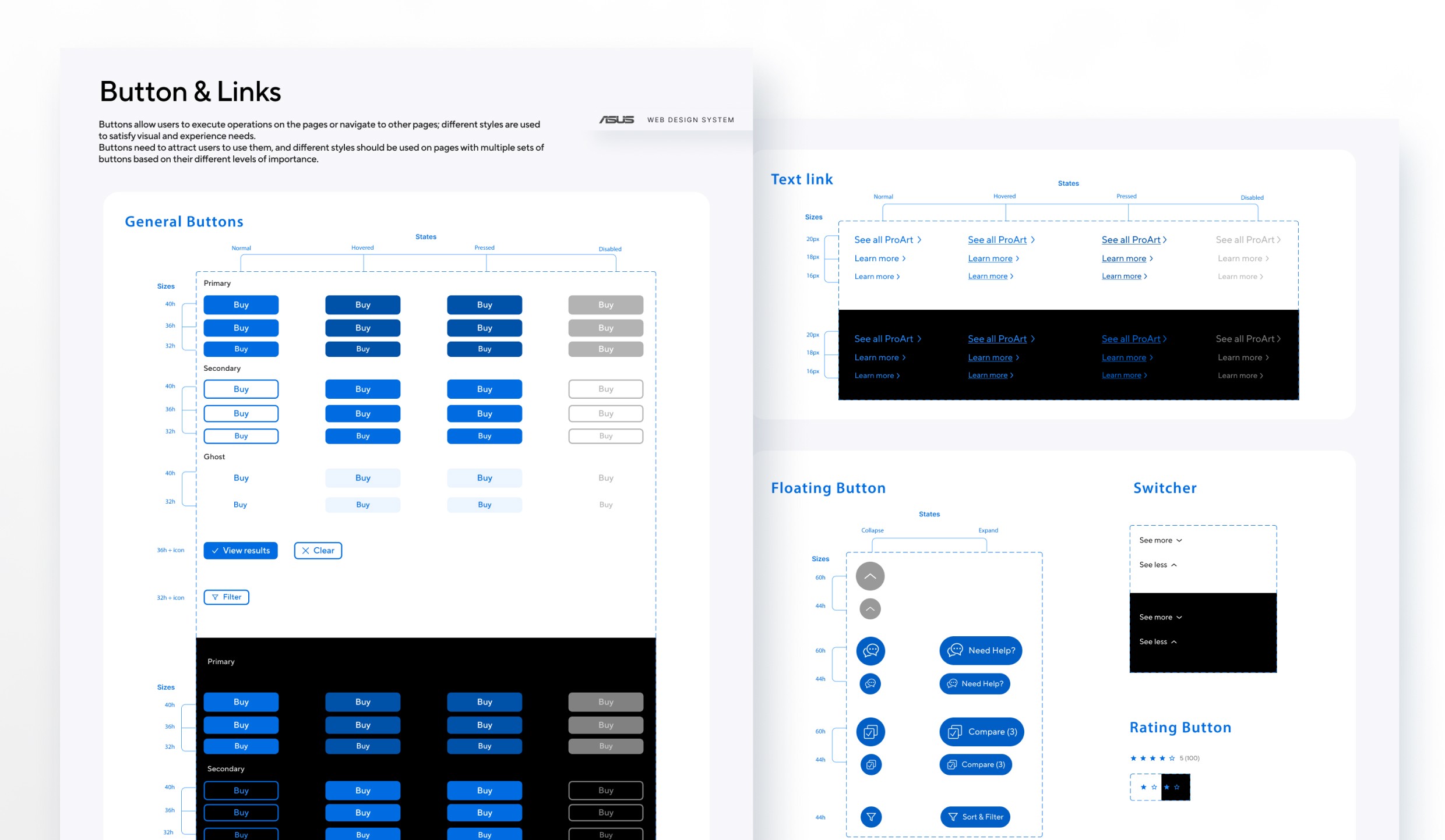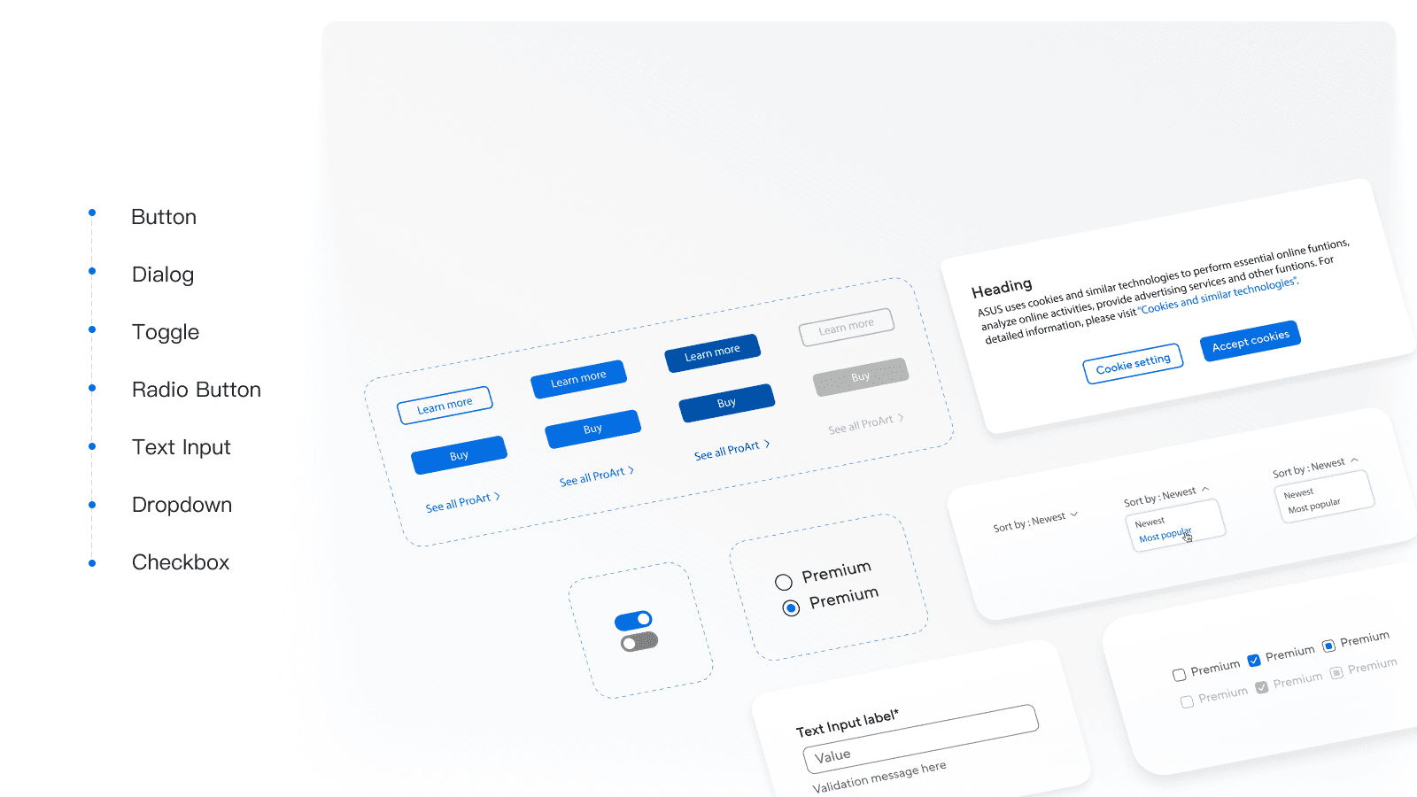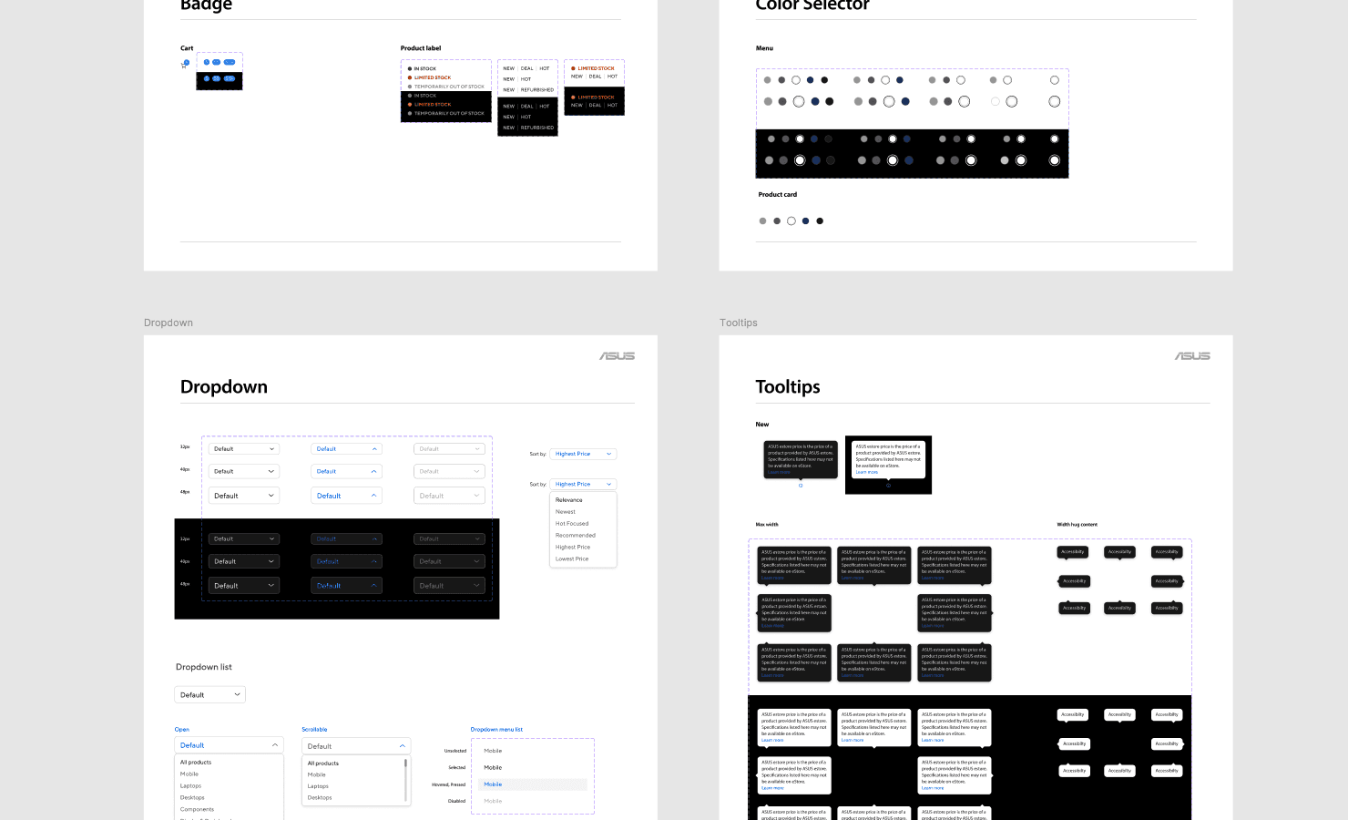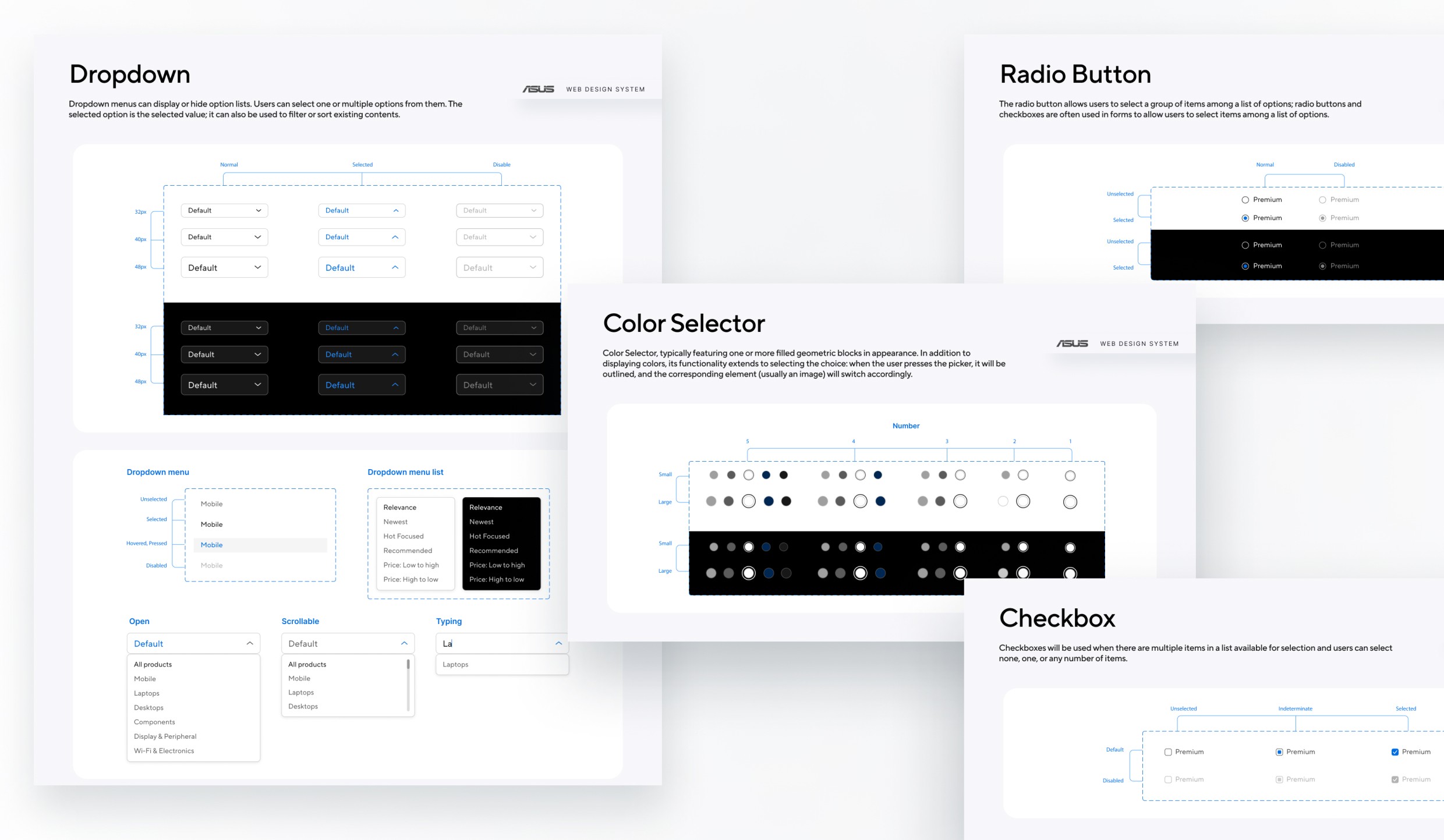 Using the established foundations, I designed a set of core web components with clearly defined structure, interaction states, and responsive behavior. Each component was built around real usage scenarios observed across ASUS web products, balancing flexibility with consistency. This approach allowed teams to reuse components confidently without reinterpreting patterns for each project.