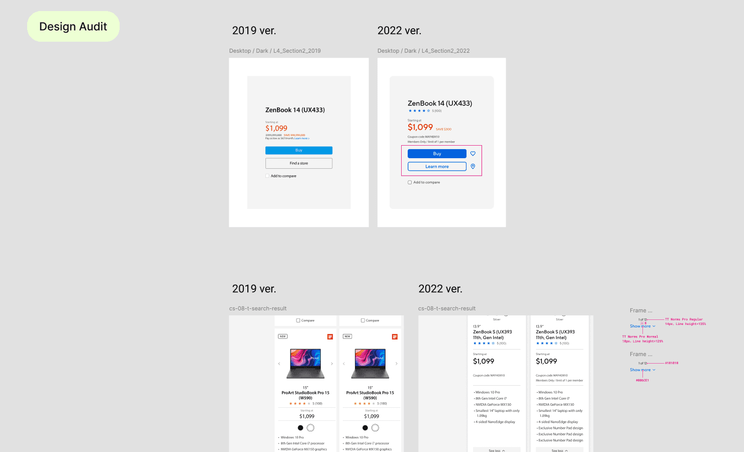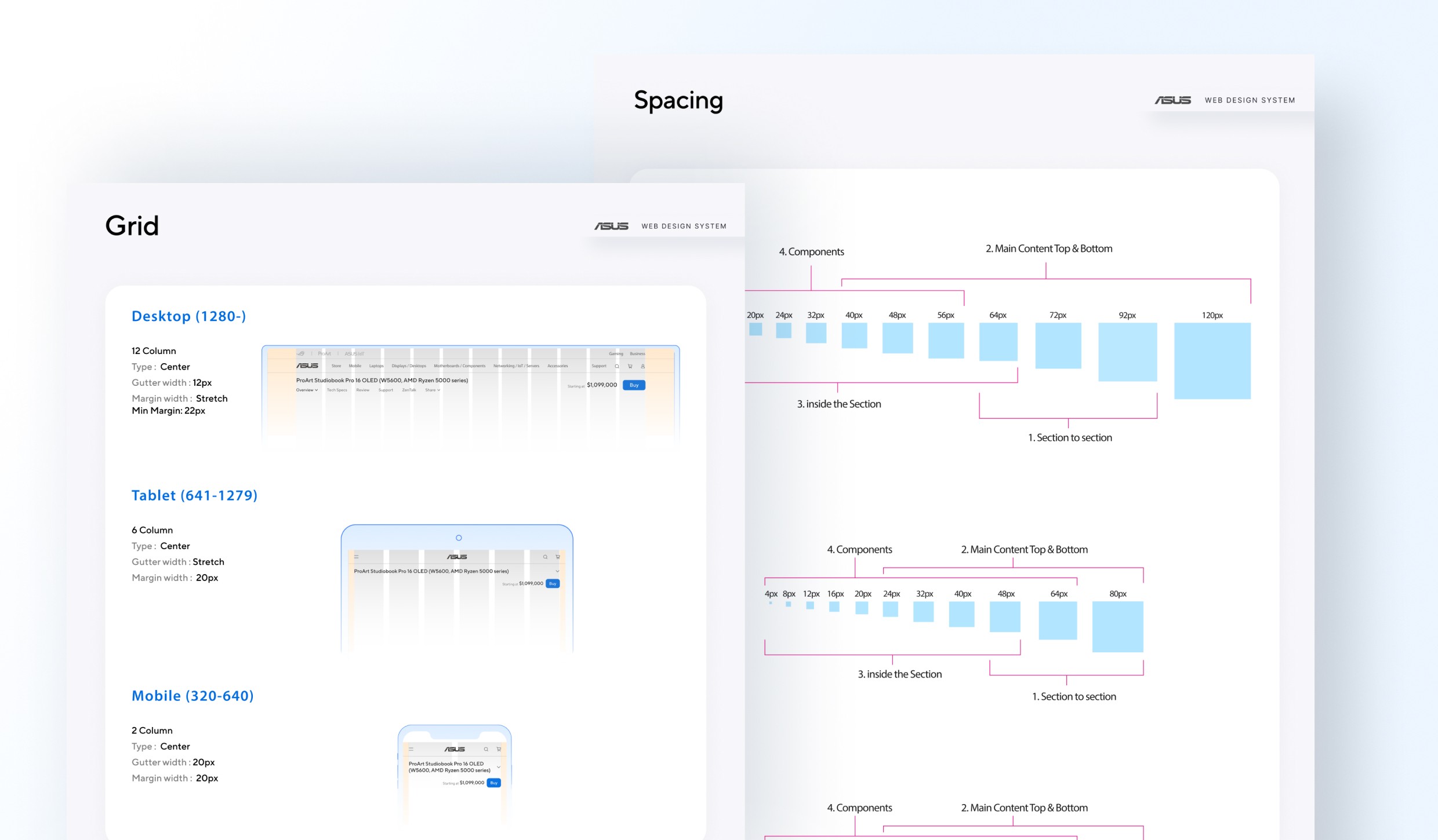 We began with a review of existing ASUS websites. Together with UX researchers, we examined layout structure, typography, color usage, spacing, and component behavior. The audit revealed duplicated components, inconsistent spacing rules, and multiple text styles used for similar purposes. These findings helped identify where a shared system would have the most impact.