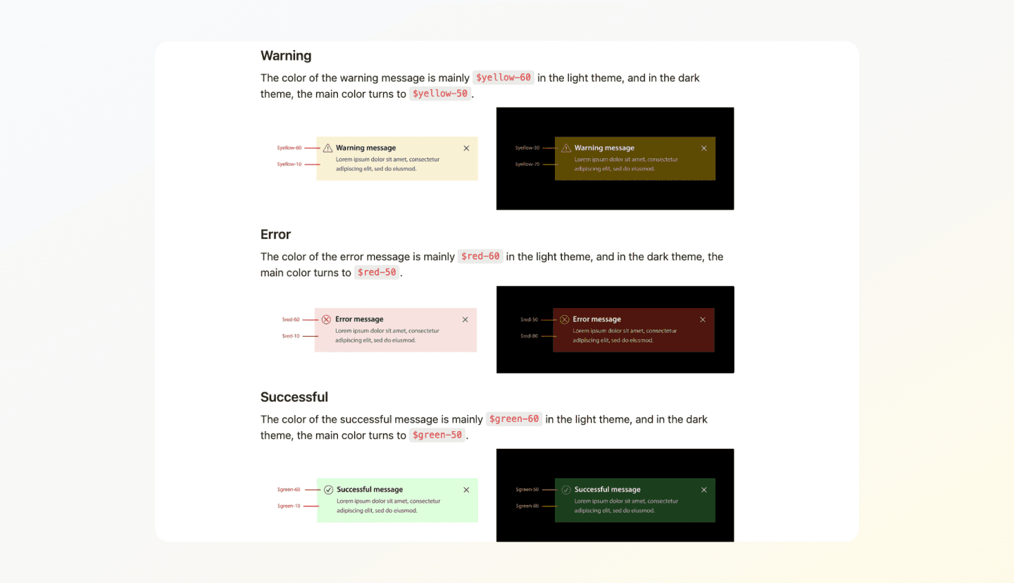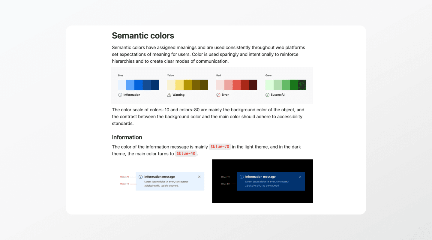 We redefined the color system around semantic intent rather than appearance, introducing tokens such as information, success, warning, and error. This approach prioritized meaning and clarity, ensuring components communicated intent consistently.