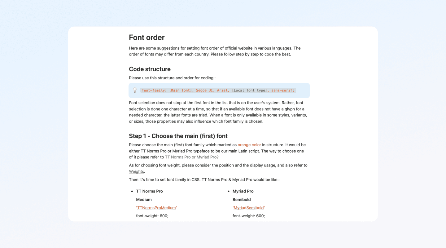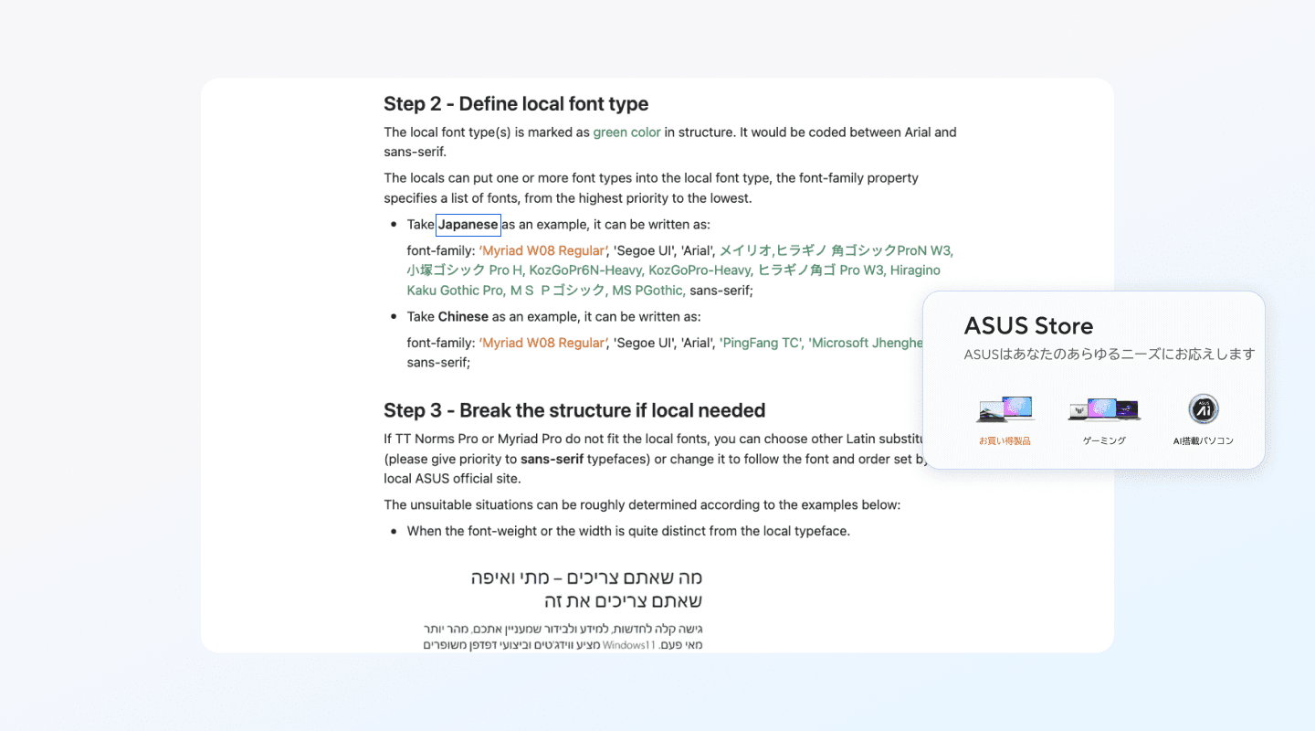 ASUS operates across global and regional markets where typography requirements vary by language, script, and platform support. A single fixed typeface could not realistically serve all use cases. To address this, we defined a scalable typography structure that established a clear font order: a primary global typeface, supported secondary fonts, and documented fallback and substitution rules when the main font was not supported locally. This ensured consistent hierarchy and behavior while allowing typography to adapt to real regional and language constraints.
